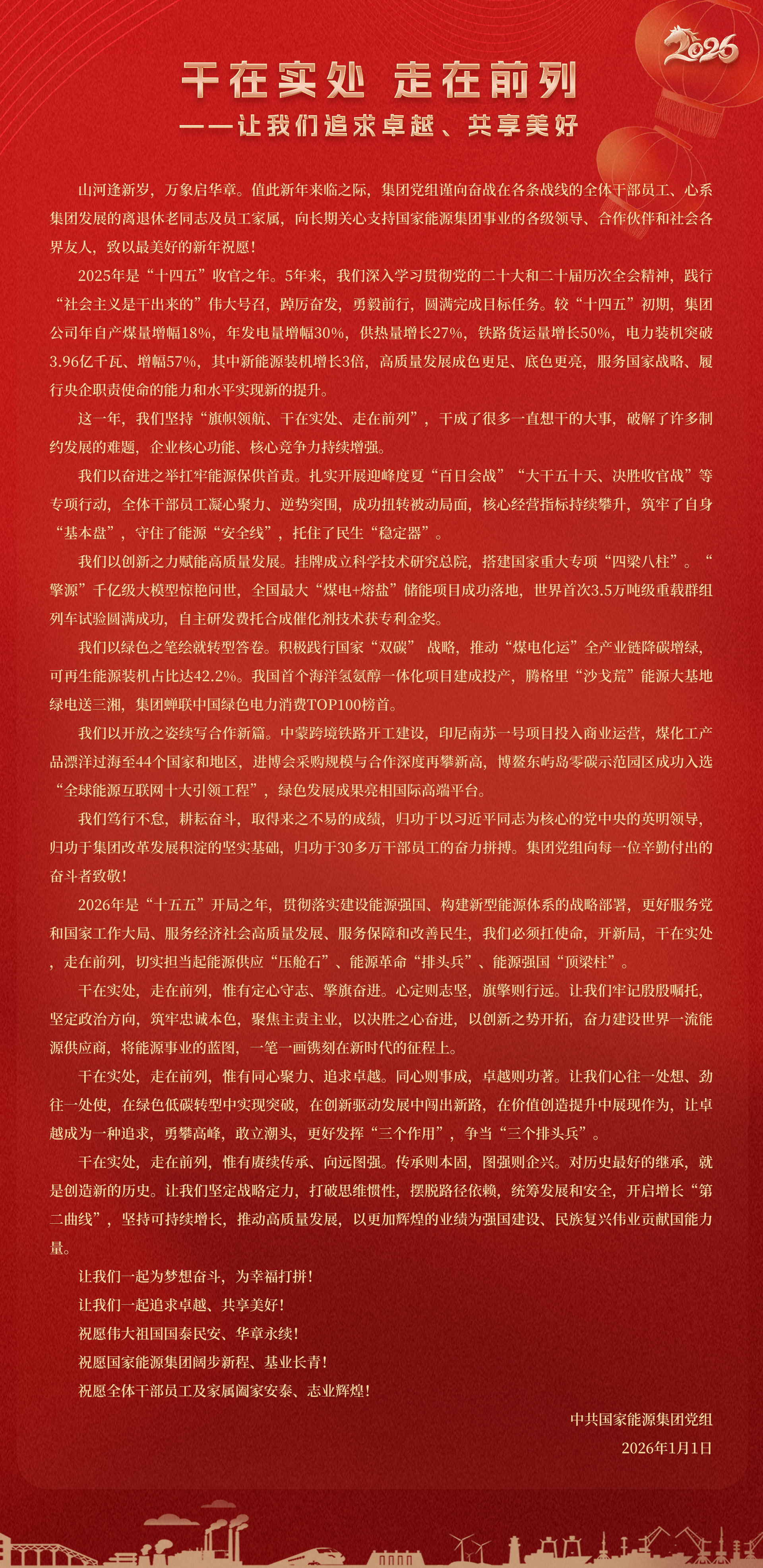 國家能源集團(tuán)胸懷“國之大者”,增產(chǎn)增供、穩(wěn)價穩(wěn)市,積極服從服務(wù)國家戰(zhàn)略、保障國家能源安全、助力國民經(jīng)濟(jì)穩(wěn)增長,推動煤炭安全綠色智能、煤電清潔高效穩(wěn)定、現(xiàn)代煤化工高端多元低碳、運輸物流協(xié)同一體、新能源多元創(chuàng)新規(guī)模化發(fā)展,全力擔(dān)當(dāng)能源強國頂梁柱,能源供應(yīng)壓艙石,能源革命排頭兵。